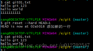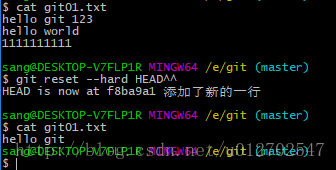 4.通过git reset –hard HEAD~1回到上一个版本: