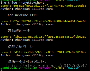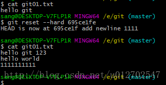 3.查看日志,发现最后一次提交的版本号是695ce1fe,利用git reset –hard 695ce1fe命令回到回退之前的状态: