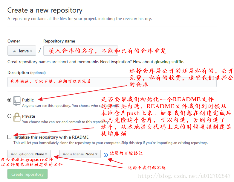 其实这里我们只需要填一个版本仓库的名字,我填了test,填好之后,点击Create repository就OK了。