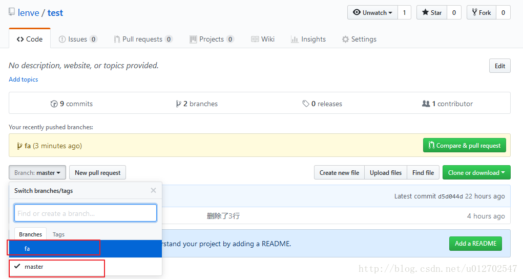 $ git push -u origin fa 先切换到fa分支,然后执行git push命令,参数含义和之前的一样,这里我们创建的远程仓库的分支名也为fa(当然我们可以取任何名字,但是为了不混淆,最好取一致的名字)。这两条命令执行成功之后,此时在网页中我们就可以看到已经有多个分支了,如下: