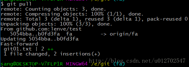 此时我们回到第一次最早的那个test本地仓库中,那个test仓库的fa分支现在和远程仓库不一致了,我们可以通过git pull命令来更新,如下: