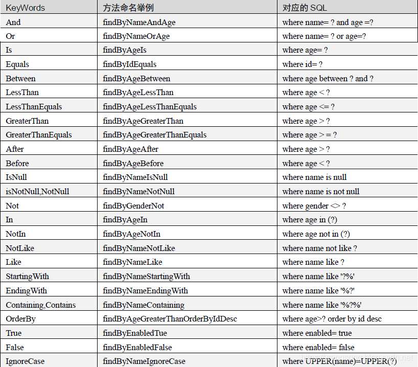 - 可能会存在一种特殊情况,比如 Doc包含一个 user 的属性,也有一个 userDep 属性,此时会存在混淆。可以明确在属性之间加上 “_” 以显式表达意图,比如 “findByUser_DepUuid()” 或者 “findByUserDep_uuid()”