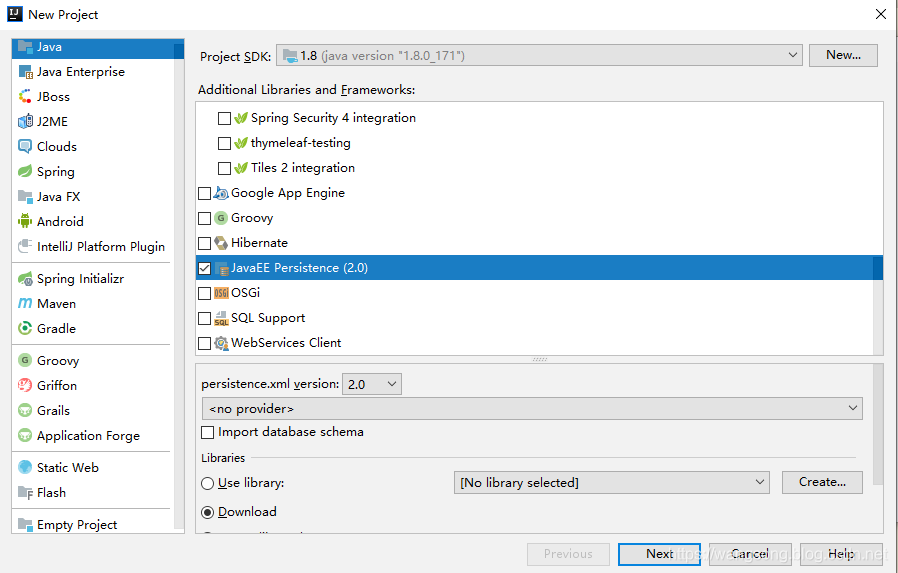 - 使用 IntelliJ IDEA 创建项目,创建时选择 JavaEE Persistence ,如下: