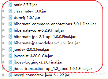 - 创建成功后,添加依赖jar,由于 Jpa 只是一个规范,因此我们说用Jpa实际上必然是用Jpa的某一种实现,那么是哪一种实现呢?当然就是Hibernate了,所以添加的jar,实际上来自 Hibernate,如下: