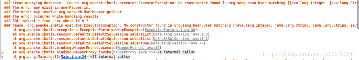 constructor主要是用来配置构造方法,默认情况下mybatis会调用实体类的无参构造方法创建一个实体类,然后再给各个属性赋值,但是有的时候我们可能为实体类生成了有参的构造方法,并且也没有给该实体类生成无参的构造方法,这个时候如果不做特殊配置,resultMap在生成实体类的时候就会报错,因为它没有找到无参构造方法。这个时候mybatis会报如下错误: