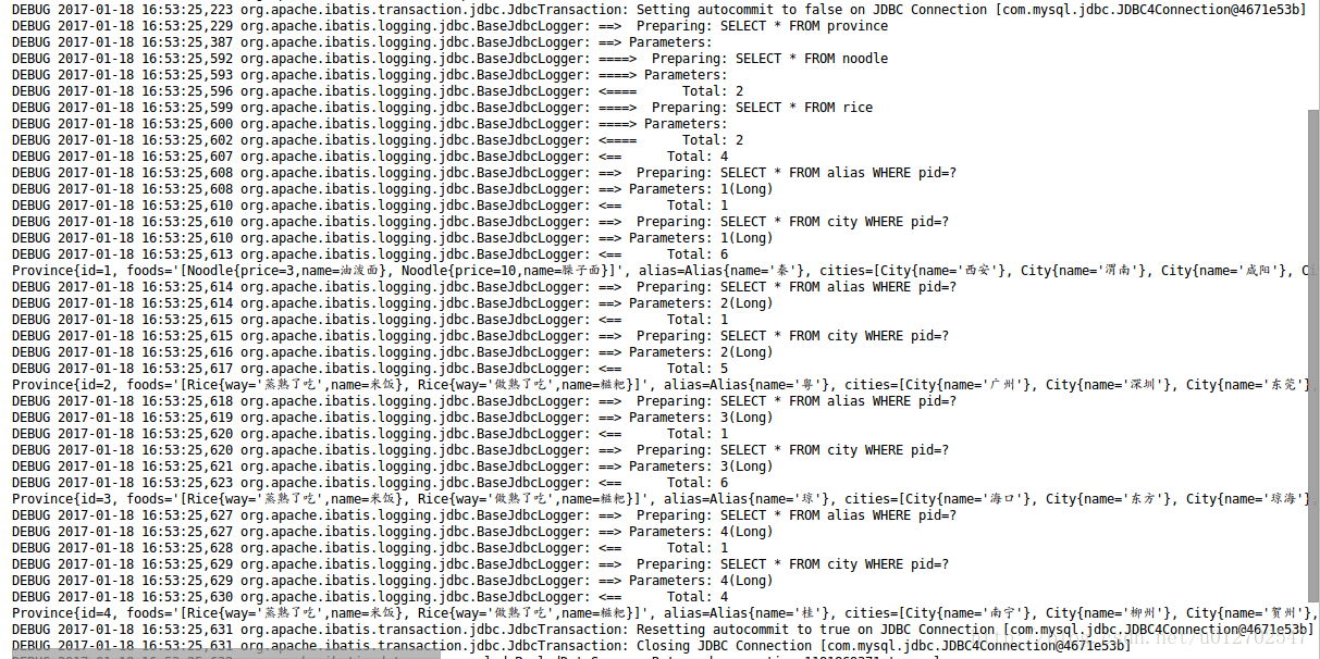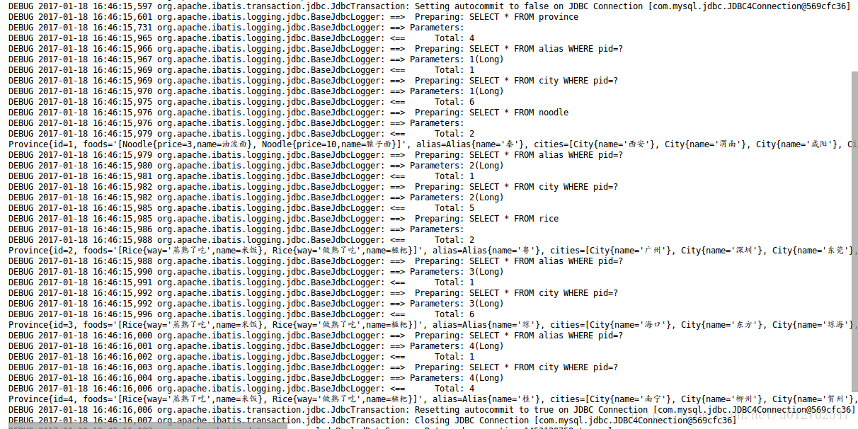 小伙伴们注意,我们在这里添加了discriminator节点,该节点有点类似于switch语句,column表示用哪个值参与比较,我们这里使用area字段进行比较,当area为0时(即北方省份)我们使用的resultMap为noodleResultMap,当area为1时(即南方省份)我们使用的resultMap为riceResultMap,然后我们在下面再分别定义riceResultMap和noodleResultMap,但是注意这两个里边返回值类型都是Province,也都是继承自provinceResultMapper,这里的继承和我们Java中面向对象的继承差不多,父类有的子类继承之后也都自动具备了。这样做时候,我们再来运行刚才的测试代码,结果如下: