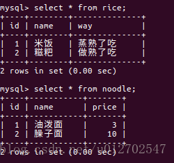 然后我在数据库中再分别创建两张表,分别是rice表和noodle表,如下: