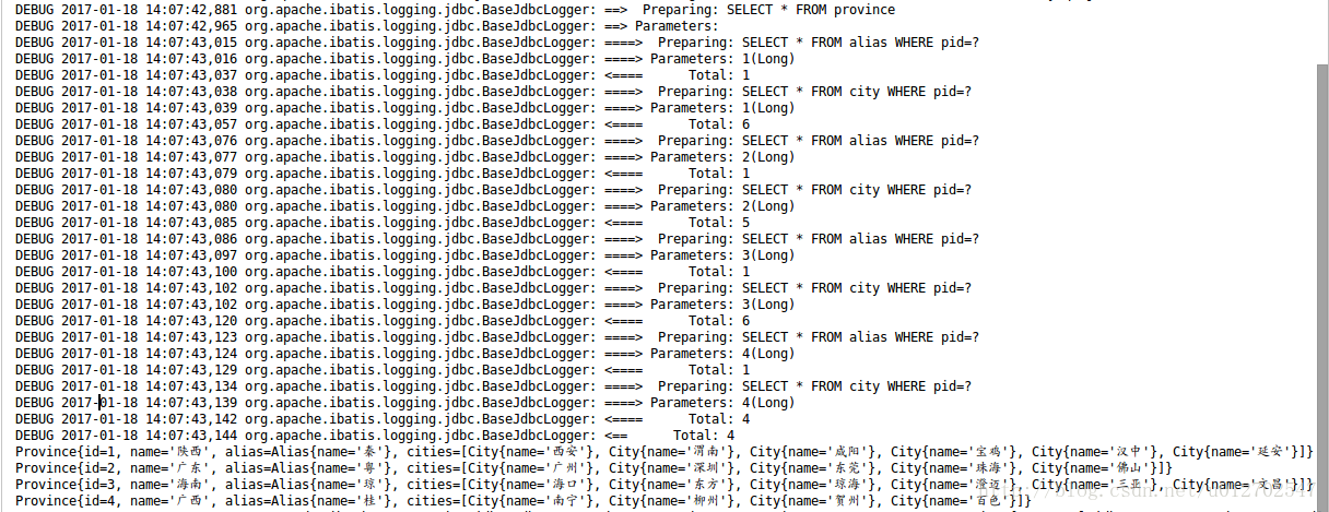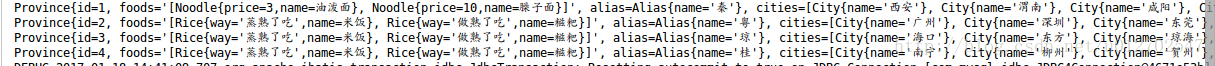 城市表中有一个pid字段,该字段表示这个城市是属于哪个省份的,OK,假设我现在Province实体类中多了一个属性叫做cities,这个cities属性的数据类型是一个List集合,这个集合中放的所有的数据就是这个省份的,我希望查询结束之后这个属性的值就会被自动填充,OK,那么在上面那个案例的基础上,我们来看看这个要怎么实现。