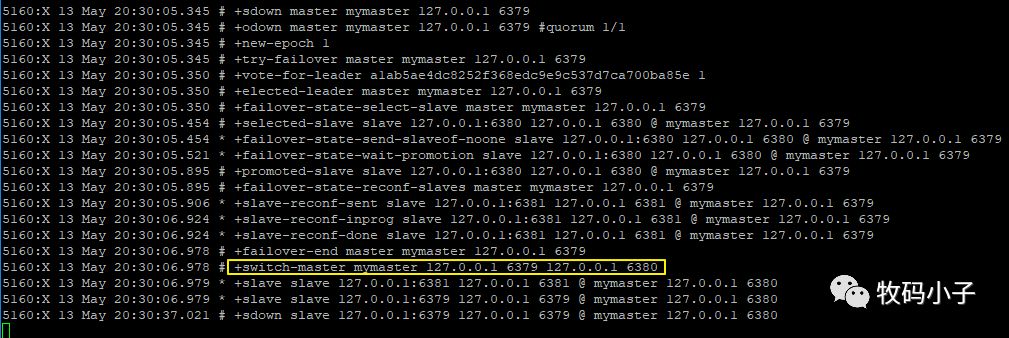 sentinel monitor mymaster 127.0.0.1 6379 1 其中mymaster是给要监控的主机取的名字,随意取,后面是主机地址,最后面的2表示有多少个sentinel认为主机挂掉了,就进行切换(我这里只有一个,因此设置为1)。好了,配置完成后,输入如下命令启动哨兵: