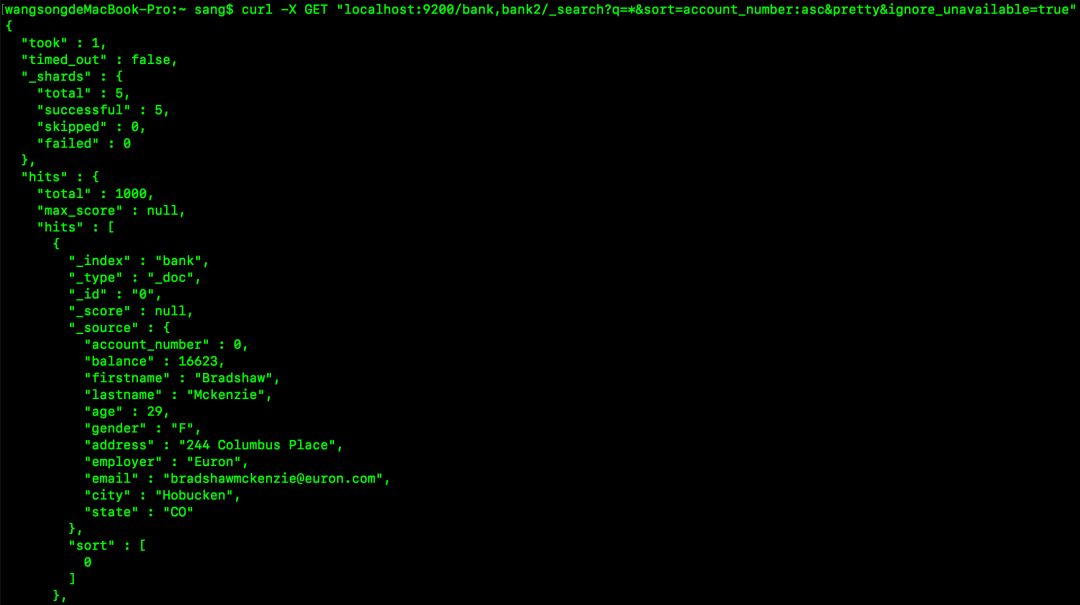 curl -X GET "localhost:9200/bank,bank2/_search?q=*&sort=account_number:asc&pretty&ignore_unavailable=true" 执行结果如下: