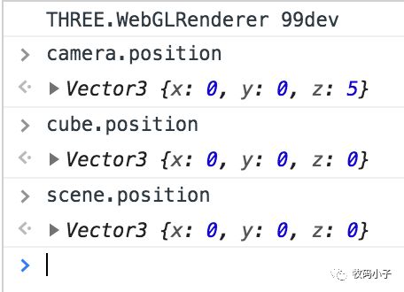 按理说,场景是不需要坐标这个概念的,其他的组件和相机是有坐标的,在上文的案例中,读者可以在浏览器控制台打印出所有的坐标: