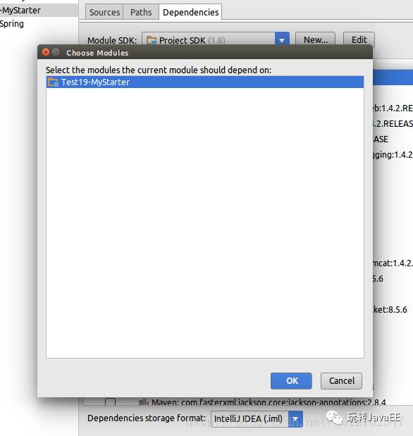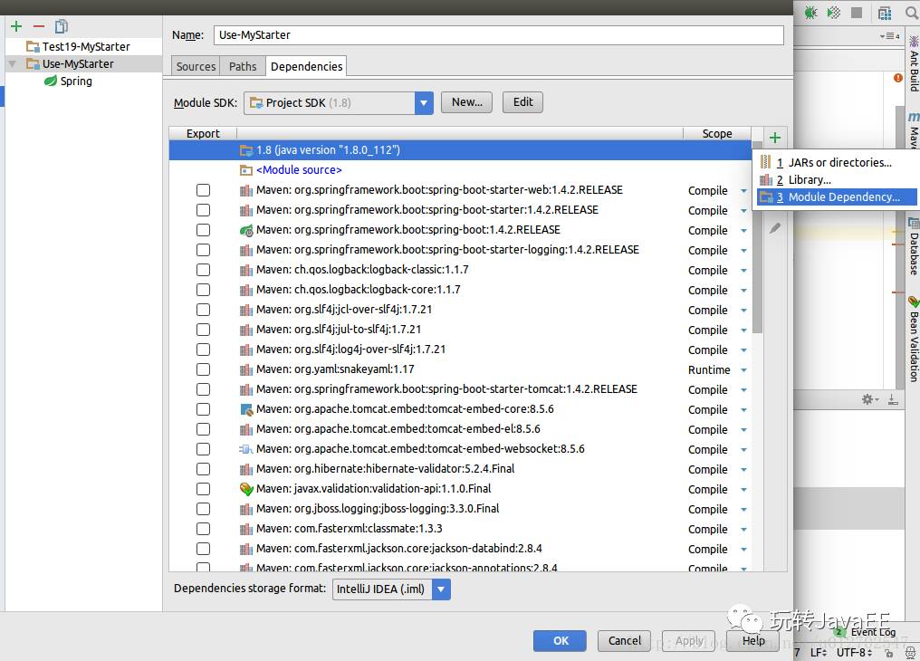 创建Module方式很简单,选中刚才的Project右键单击,New一个Module,这个Module是一个SpringBoot项目(不清楚怎么创建SpringBoot项目可以查看这篇文章初识Spring Boot框架),创建成功之后选择新建的Module按F4打开Module设置,然后选择右边的加号添加依赖,如下: