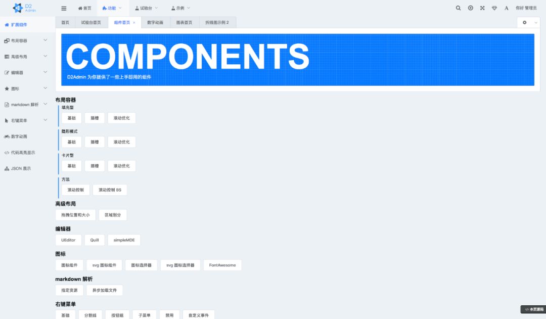 D2Admin 是一个完全开源免费的企业中后台产品前端集成方案,使用最新的前端技术栈,已经做好大部分项目前期准备工作,并且带有大量示例代码,助力管理系统敏捷开发。