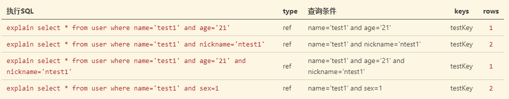 INSERT INTO `user` VALUES ('6', '25', 'test6', '0', 'ntest6'); 单表复合索引