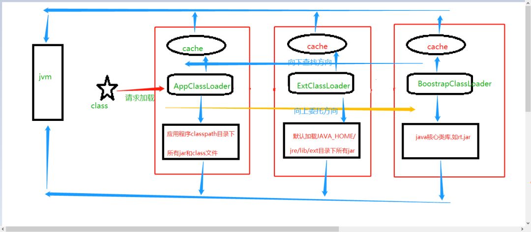 最终到达 BoostrapClassLoader ,会先在缓存中找,没有就尝试在自己能加载的路径去加载,找不到就交给 ExtClassLoader ,同理一直到用户自定义的 ClassLoader ,这就是向下查找方向。