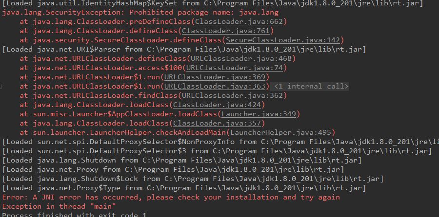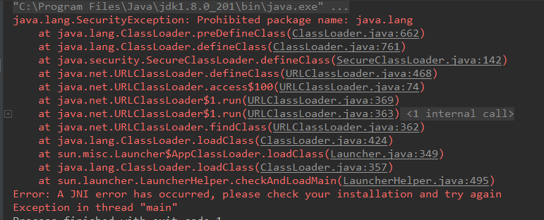 } 我们再定义一个自定义的 java.lang.MyLong 类,执行 main 方法,报错如下