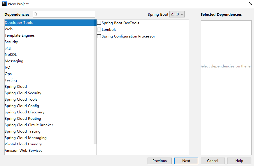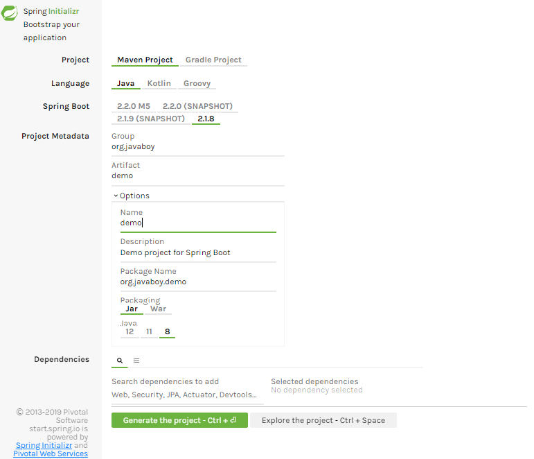 - Spring Boot 版本,可以看到,目前最新的稳定版是 2.1.8 ,这里我们就是用最新稳定版。
