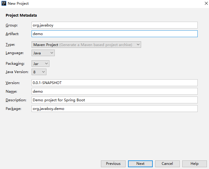 - Packing 表示项目要打包成 jar 包还是 war 包,Spring Boot 的一大优势就是内嵌了 Servlet 容器,打成 jar 包后可以直接运行,所以这里建议打包成 jar 包,当然,开发者根据实际情况也可以选择 war 包。