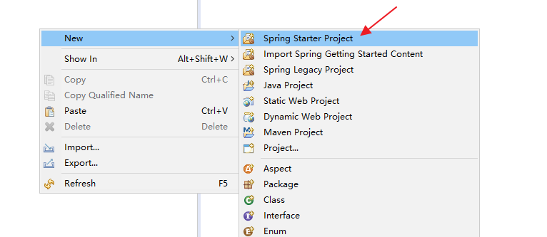 首先右键单击,选择 New -> Spring Starter Project ,如下图: