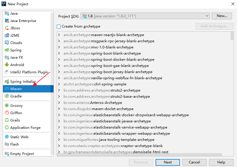 上面提到的几种方式,实际上都借助了 https://start.spring.io/ 这个网站,松哥记得在 2017 年的时候,这个网站还不是很稳定,经常发生项目创建失败的情况,从2018年开始,项目创建失败就很少遇到了,不过有一些读者偶尔还是会遇到这个问题,他们会在微信上问松哥这个问题腰怎么处理?我一般给的建议就是直接使用 Maven 来创建项目。步骤如下: