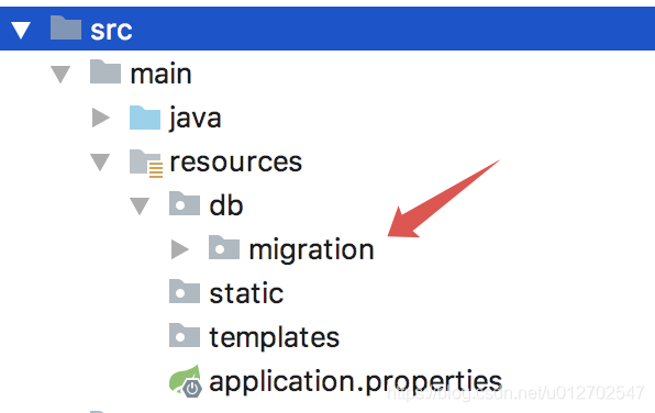 项目创建成功后,resources 目录下也会多出来一个 db/migration 目录,这个目录用来存放数据库脚本,如下: