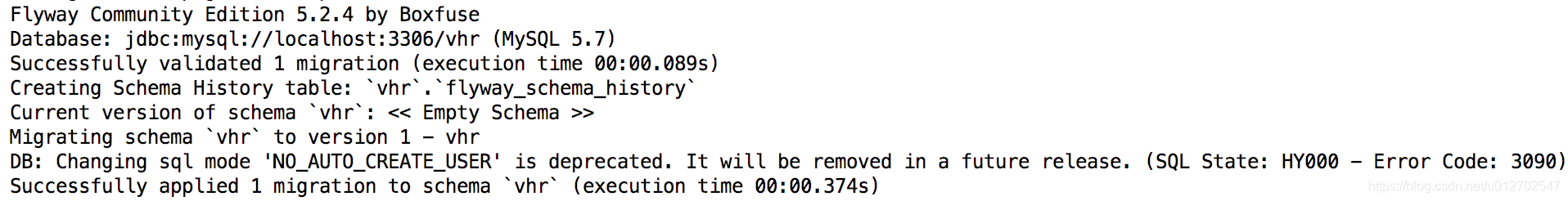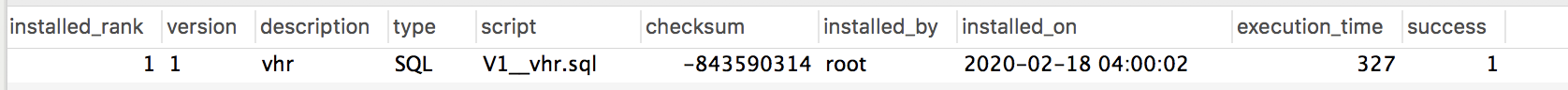 有了这条记录,下次再启动 vhr 项目,V1__vhr.sql 这个脚本文件就不会执行了,因为系统知道这个脚本已经执行过了,如果你还想让 V1__vhr.sql 脚本再执行一遍,需要手动删除 flyway_schema_history 表中的对应记录,那么项目启动时,这个脚本就会被执行了。