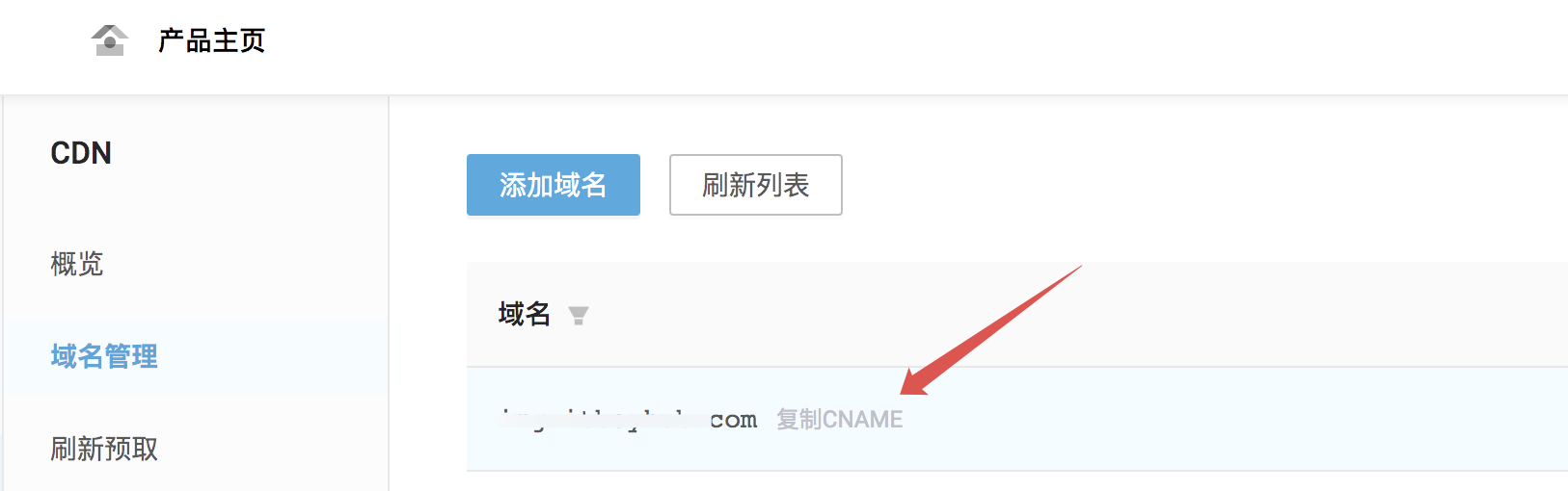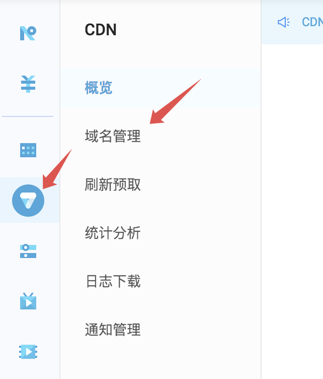 首先点击左边菜单栏的 CDN,然后再点击域名管理。