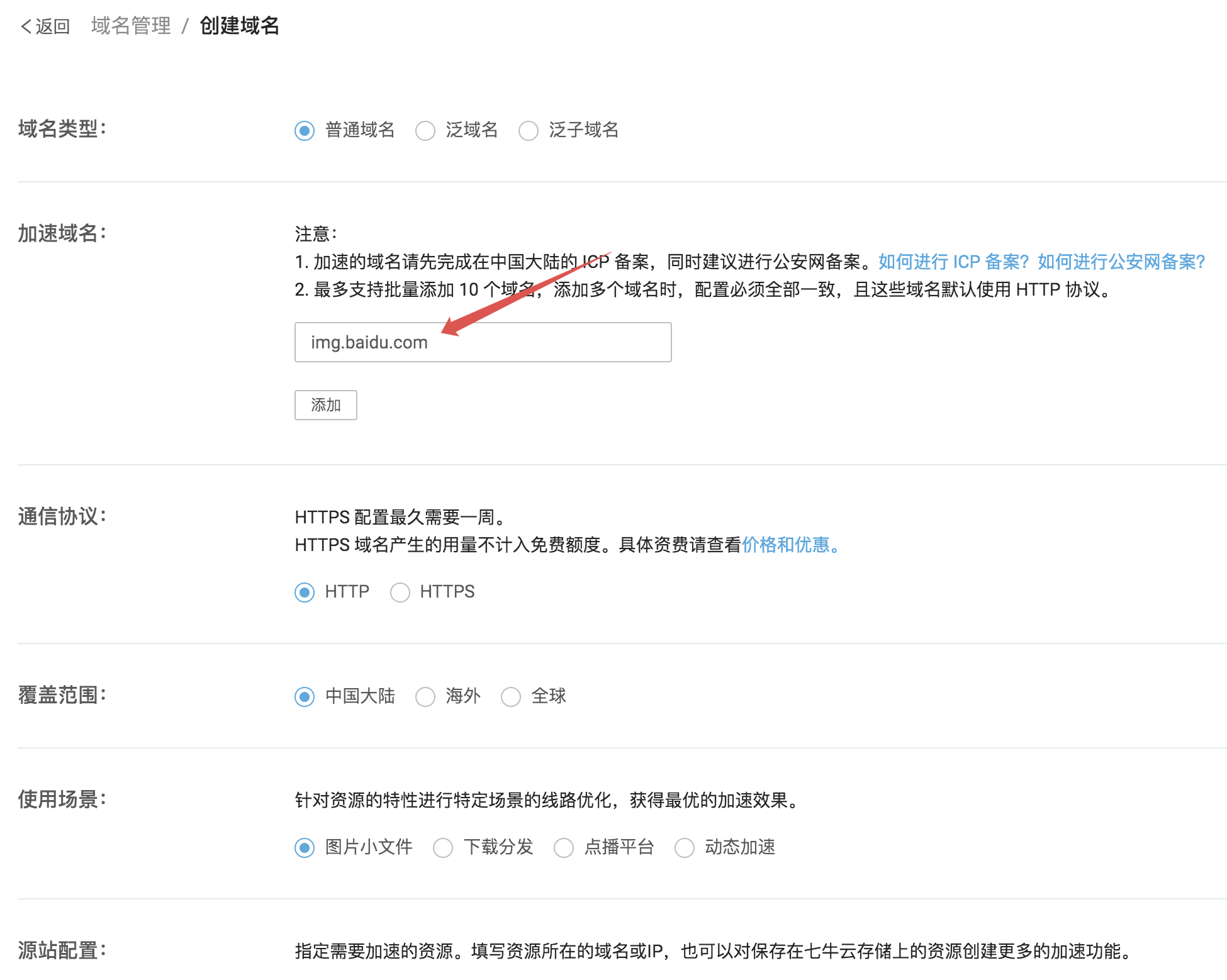 默认情况下,只有一个测试域名,我们点击上方的 添加域名,添加自己的域名进来,这里如果没有特殊需求,配置一下域名地址即可,其他都使用默认即可:
