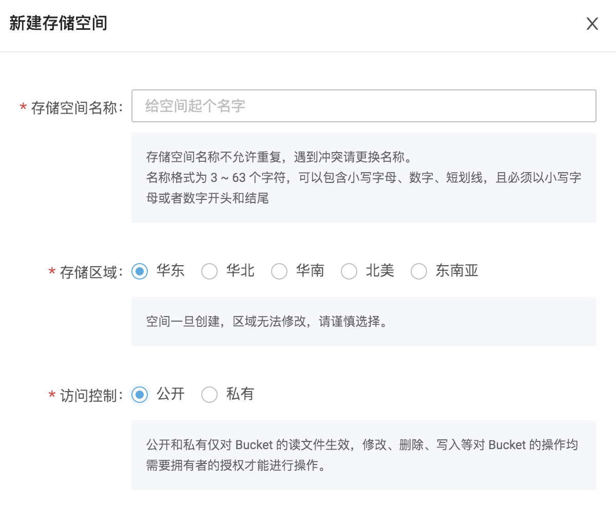 然后给新的存储空间取一个名字,选择合适的存储区域,由于我们是要搭建自己的图床,所以最后一项访问控制选择公开,切勿选错。