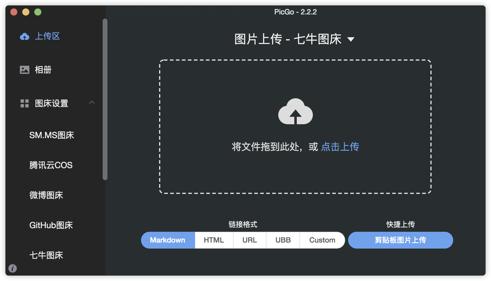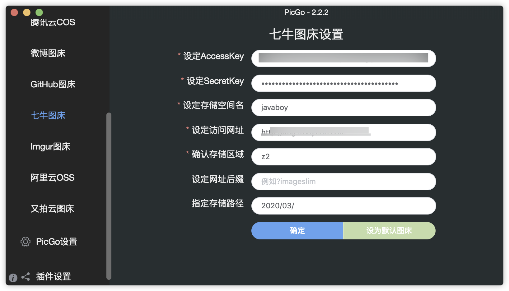 安装好之后,在图床配置里边,配置一下七牛图床: