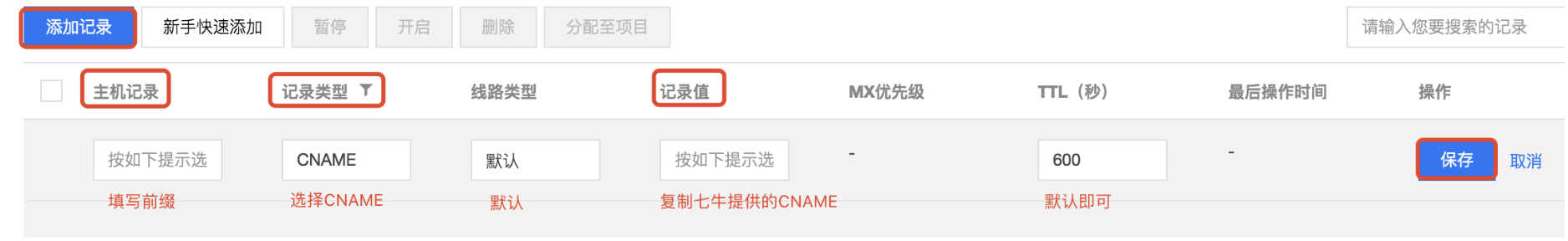 把这个 CNAME 复制下来,然后打开自己的域名服务商控制台,添加一条 CNAME 解析记录,像下面这样: