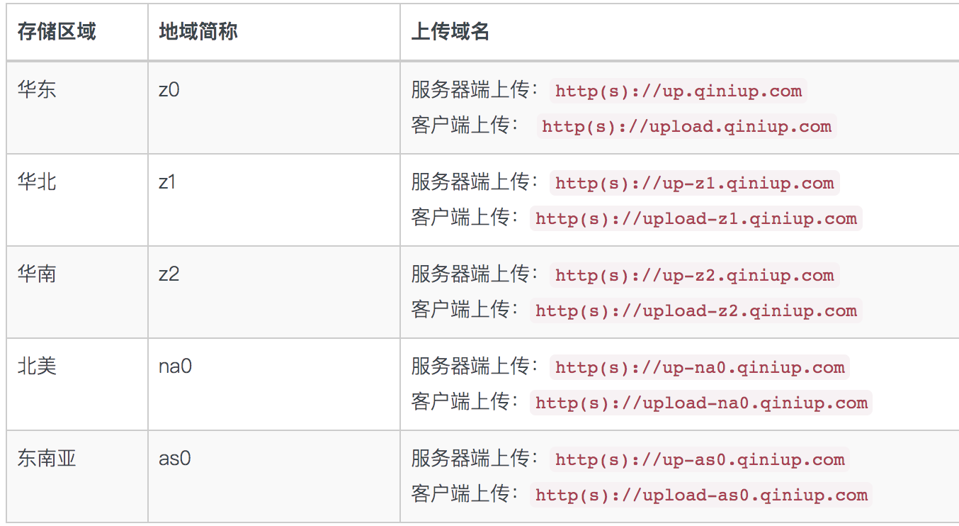 AccessKey、SecretKey 都可以从你的七牛后台的个人中心页面看到,直接复制过来即可。存储空间名就是你一开始创建的存储空间,访问地址则是你自己的域名,例如 http://img.javaboy.org。存储区域根据自己一开始选择的华南/华东/华北等,根据实际情况填写,但是这里注意填写区域简称: