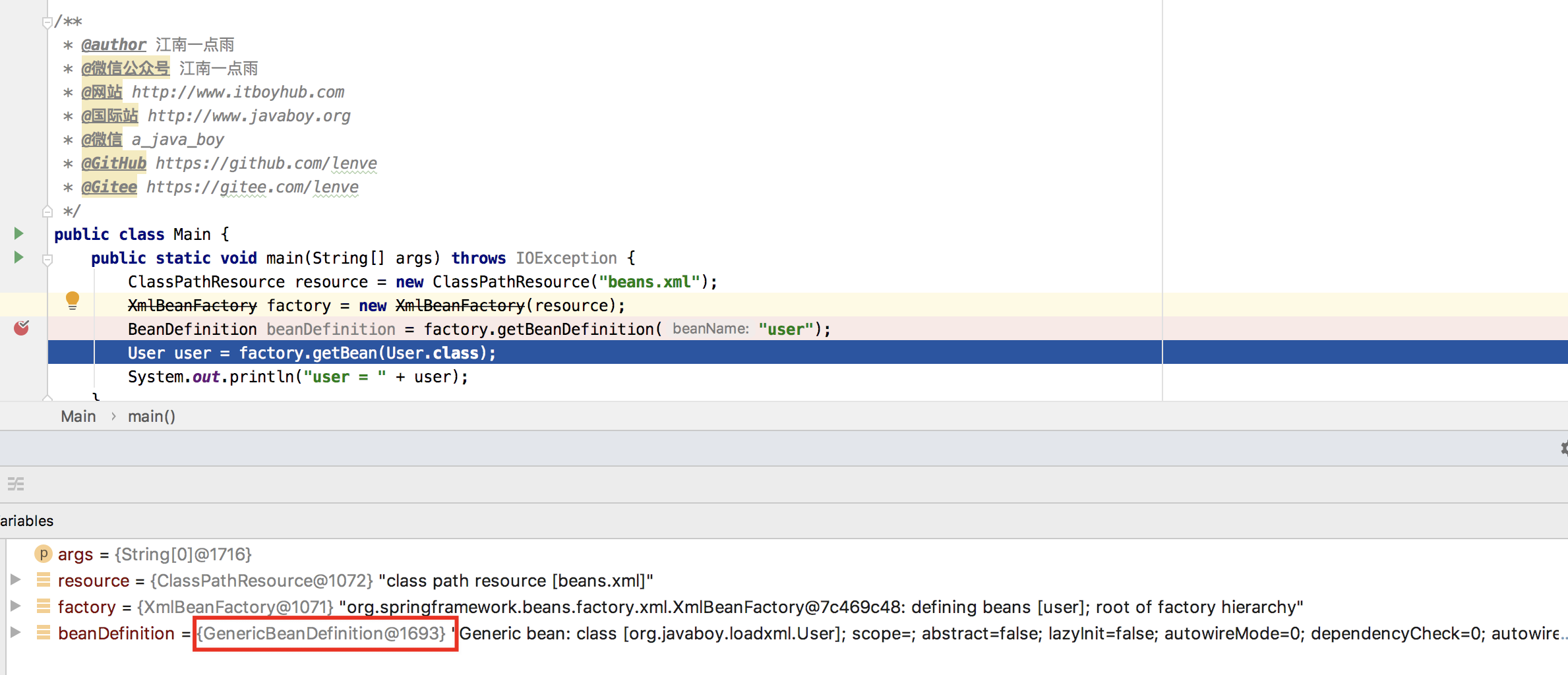 在我们本系列前面文章(Spring 源码第一篇开整!配置文件是怎么加载的?)的案例中,默认使用的也是 GenericBeanDefinition,如下: