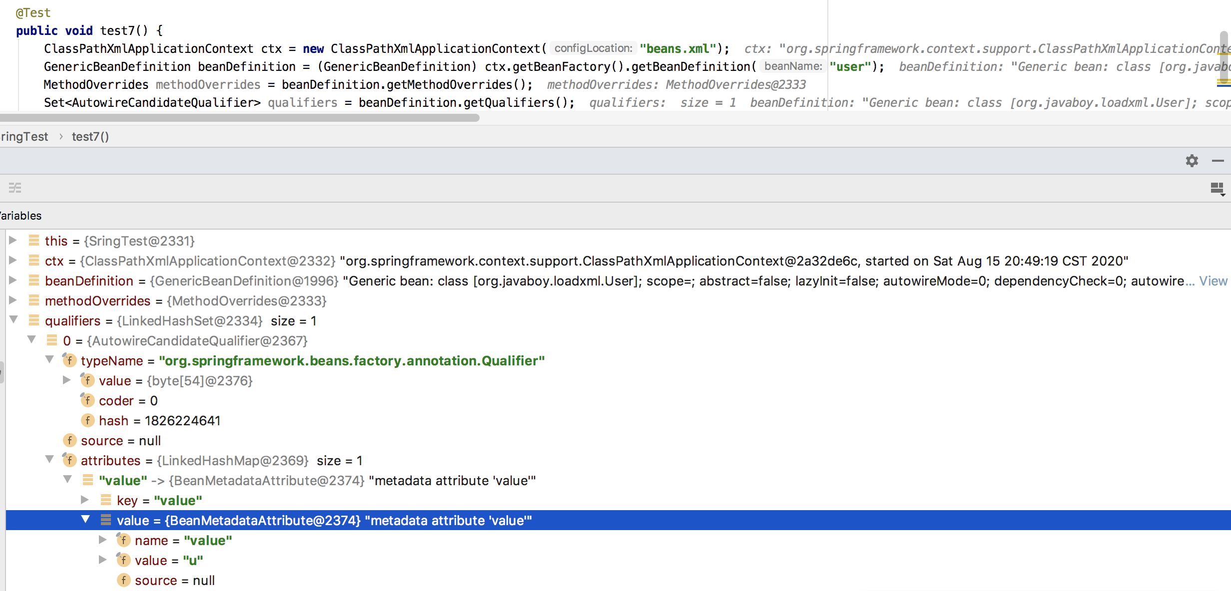 parseQualifierElements 就是用来解析 qualifier 节点的,最终也是保存在对应的属性中。解析过程和前面的类似,我就不再赘述了,我们来看下解析结果: