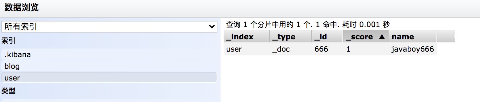 执行完成后,就会创建一个名为 user 的索引,同时向该索引中添加一条记录,再修改该记录,最终结果如下: