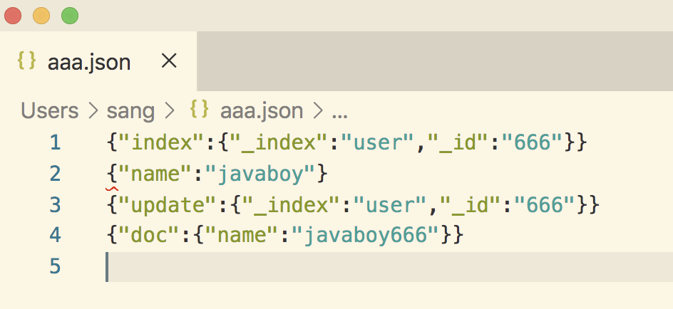 首先第一行:index 表示要执行一个索引操作(这个表示一个 action,其他的 action 还有 create,delete,update)。_index 定义了索引名称,这里表示要创建一个名为 user 的索引,_id 表示新建文档的 id 为 666。