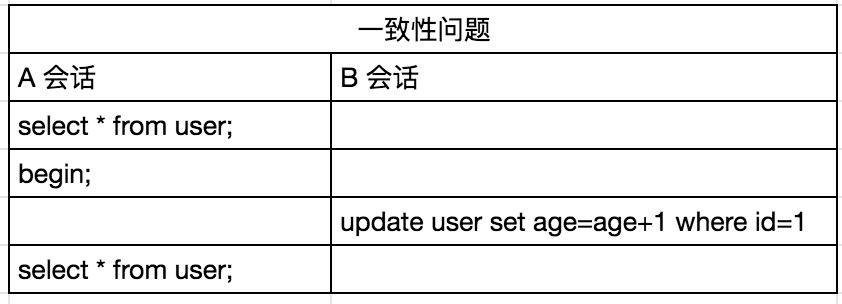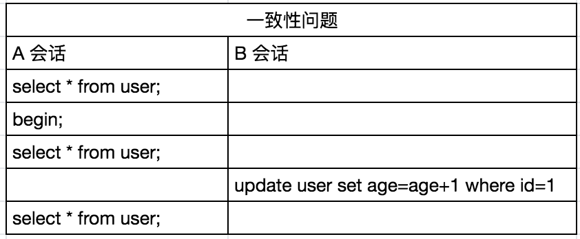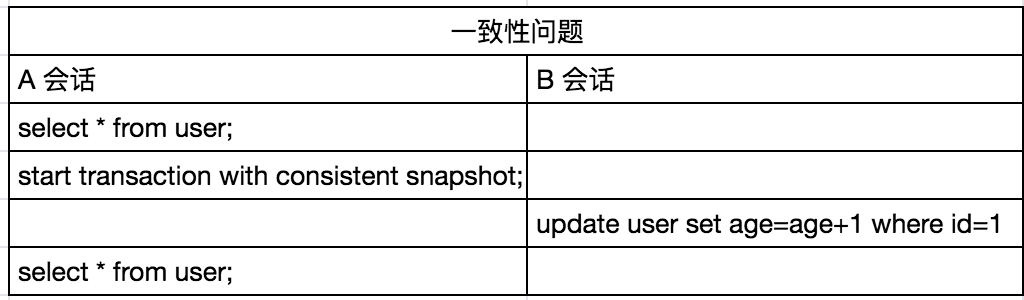 从这个角度来说,第一小节的案例似乎也没有问题,因为我们在 A 会话中执行 SELECT 语句多次,查到的结果也都是相同的,age 都是 102。