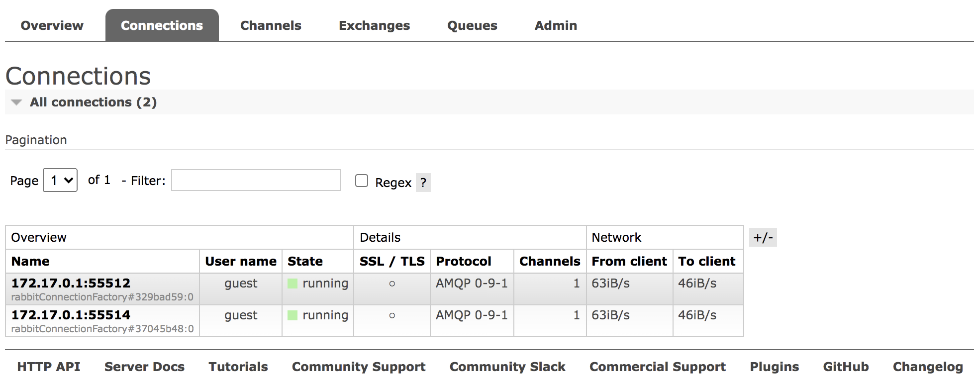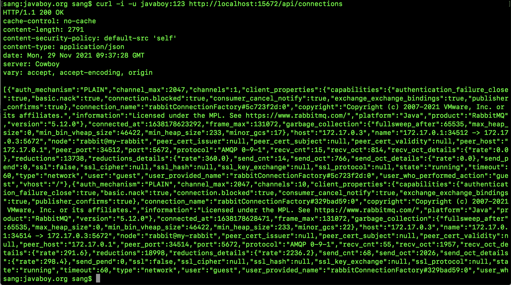 exchange/queue等,这个松哥之前写过专门的文章,传送门:RabbitMQ 中的 VirtualHost 该如何理解。 - Connection: publisher/consumer 和 broker 之间的 TCP 连接,断开连接的操作只会在 client 端进行,Broker 不会断开连接,除非出现网络故障或 broker 服务出现问题。