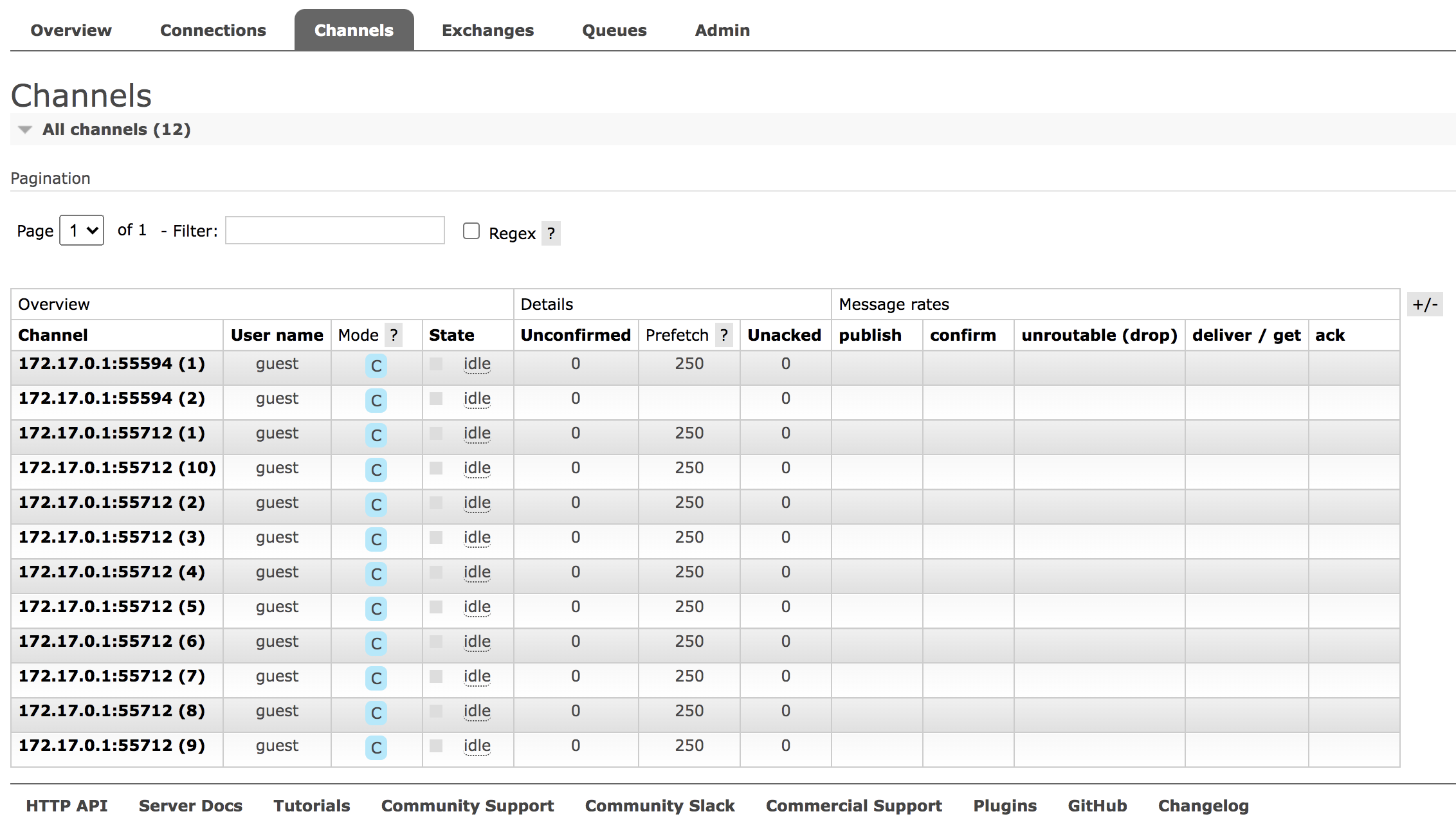 这条消息发送成功之后,在 RabbitMQ 的 Web 管理端,我们会看到三个 RabbitMQ 实例上都会显示有一条消息,但是实际上消息本身只存在于一个 RabbitMQ 实例。