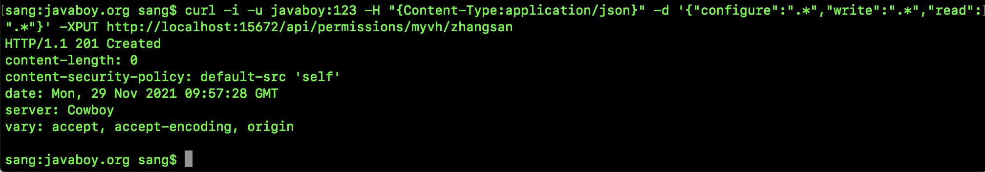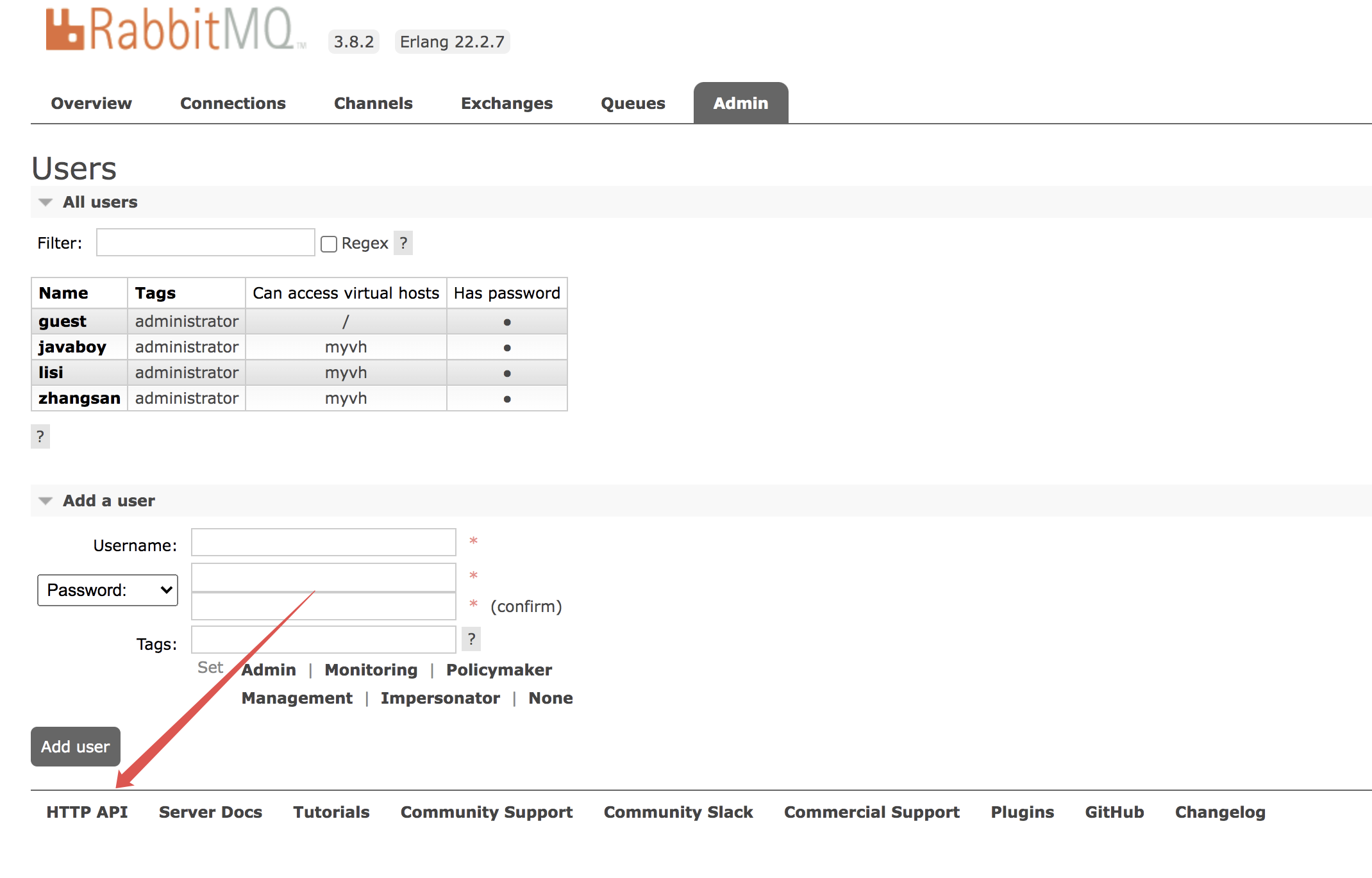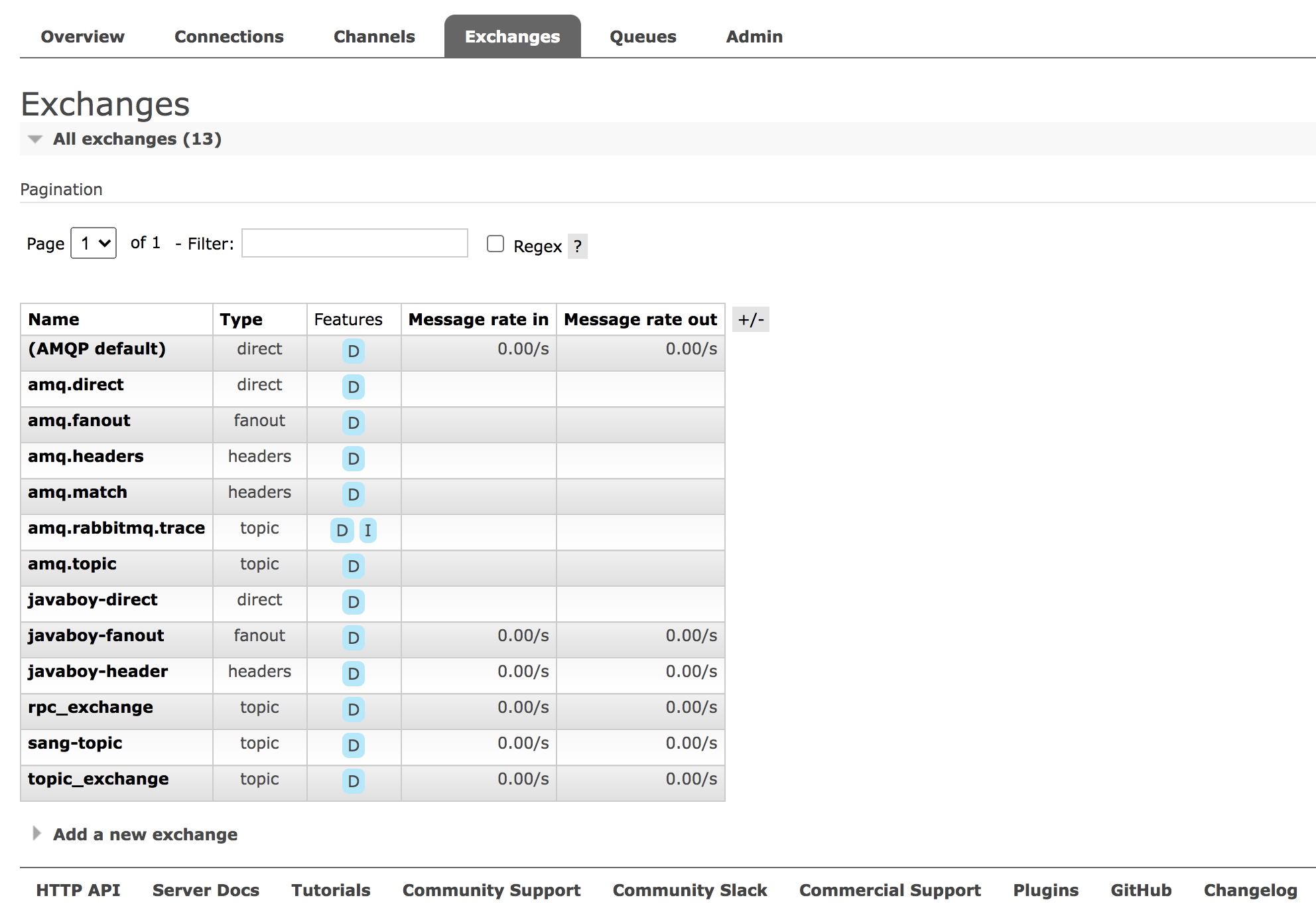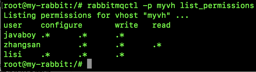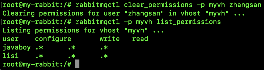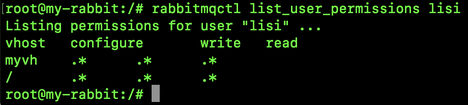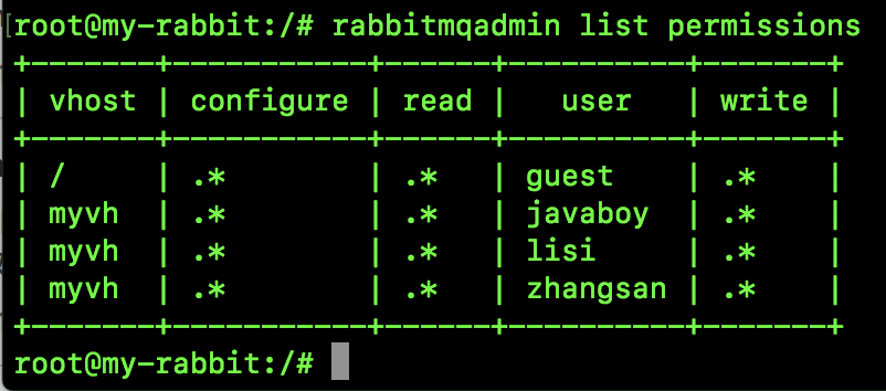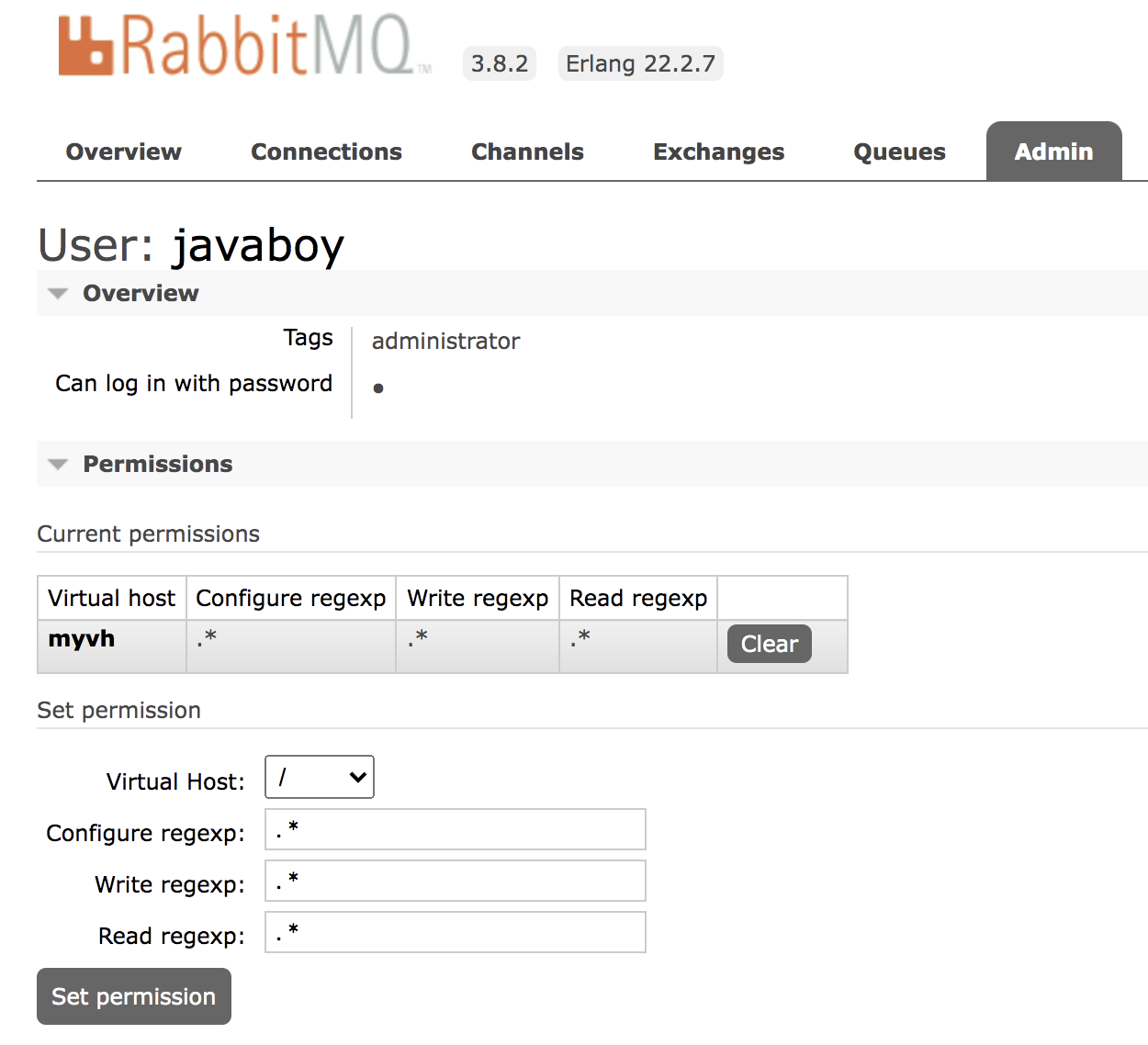当然,在网页上还有一个 Topic Permissions,这是 RabbitMQ3.7 开始的一个新功能,可以针对某一个 topic exchange 设置权限,主要针对 STOMP 或者 MQTT 协议,我们日常 Java 开发用上这个配置的机会很少。如果用户不设置的话,相应的 topic exchange 也总是有权限的。