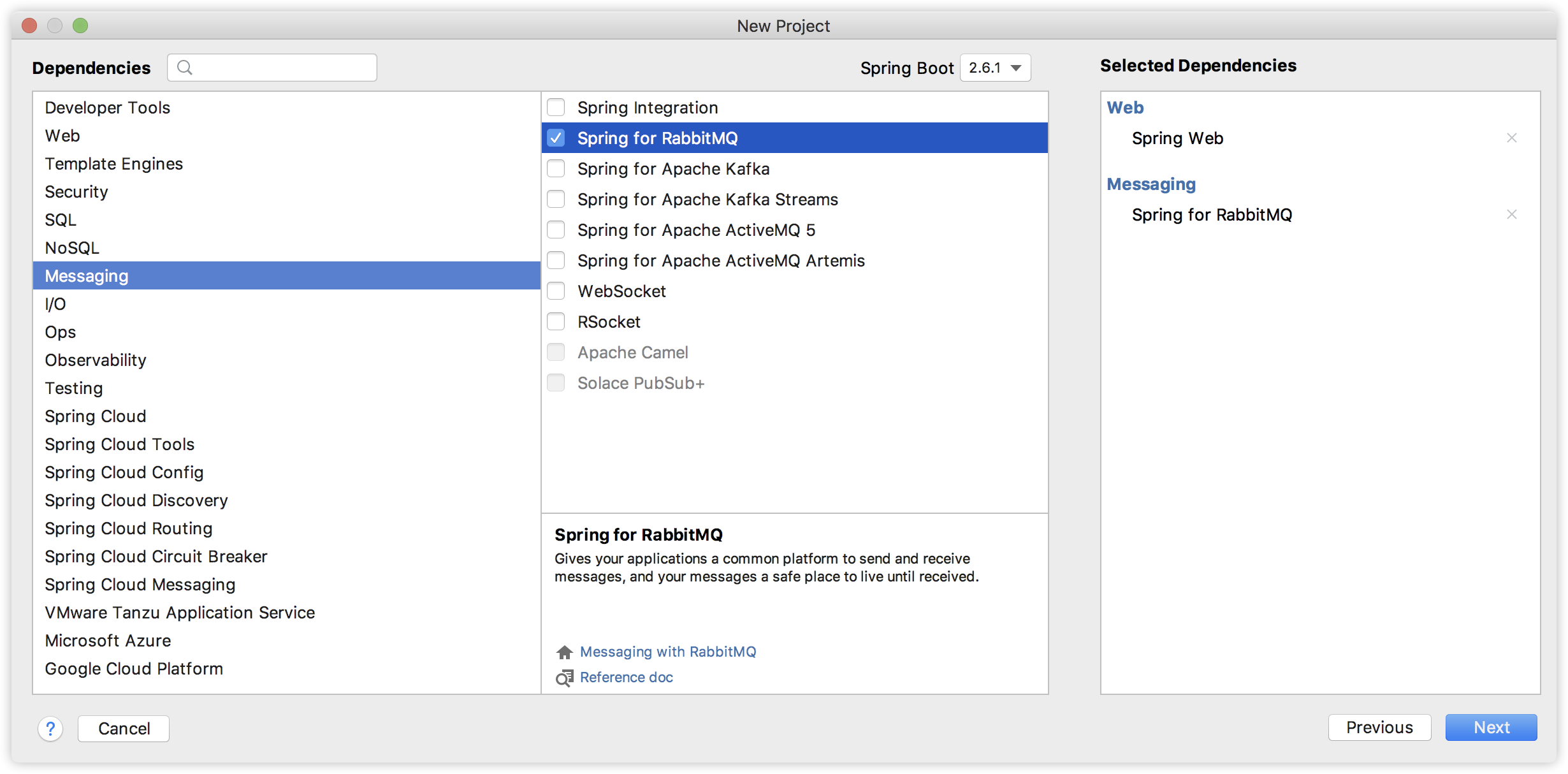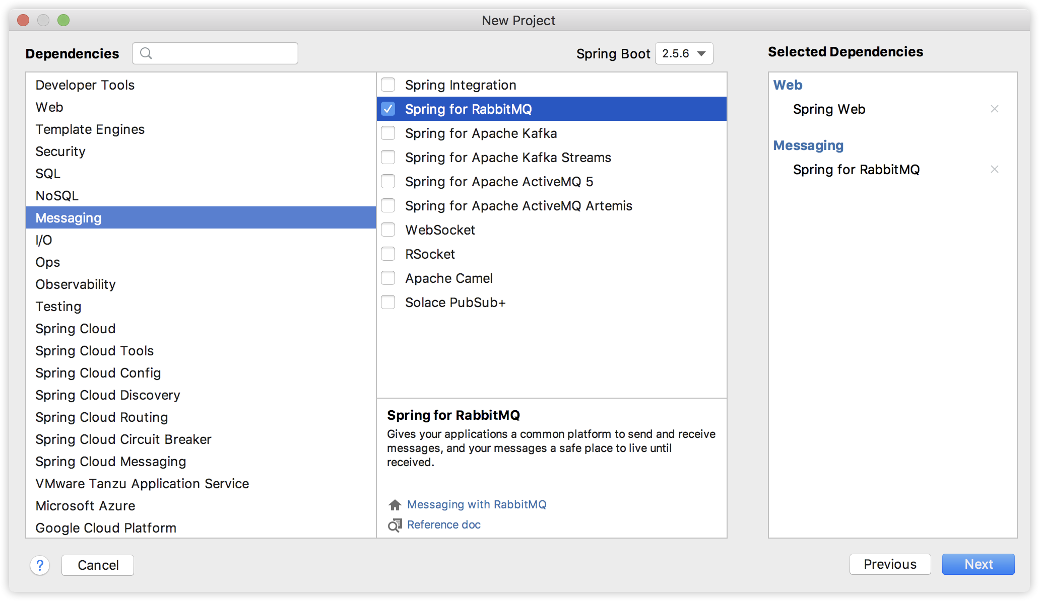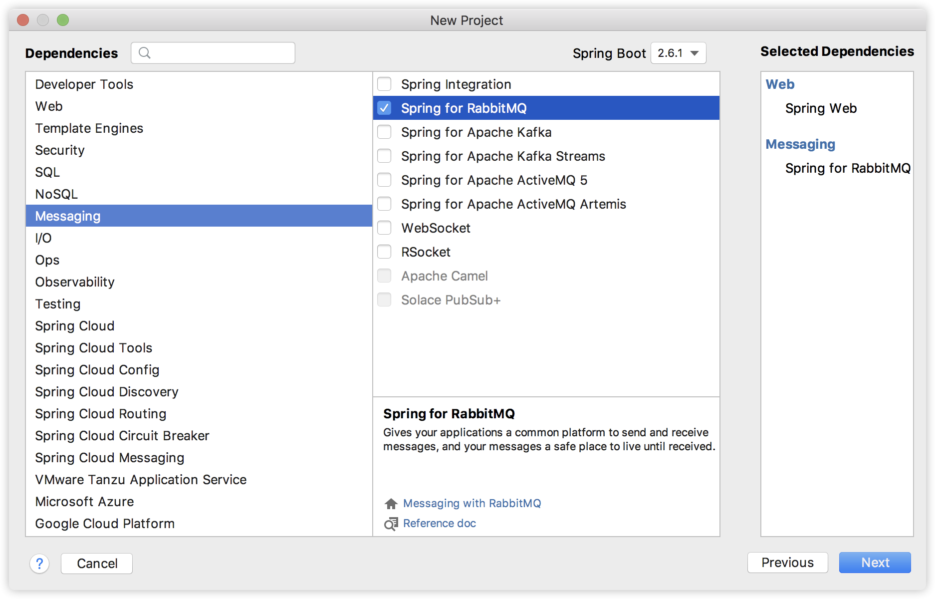 第一个子工程名为 provider,是一个消息生产者,创建时引入 Web 和 RabbitMQ 依赖,如下: