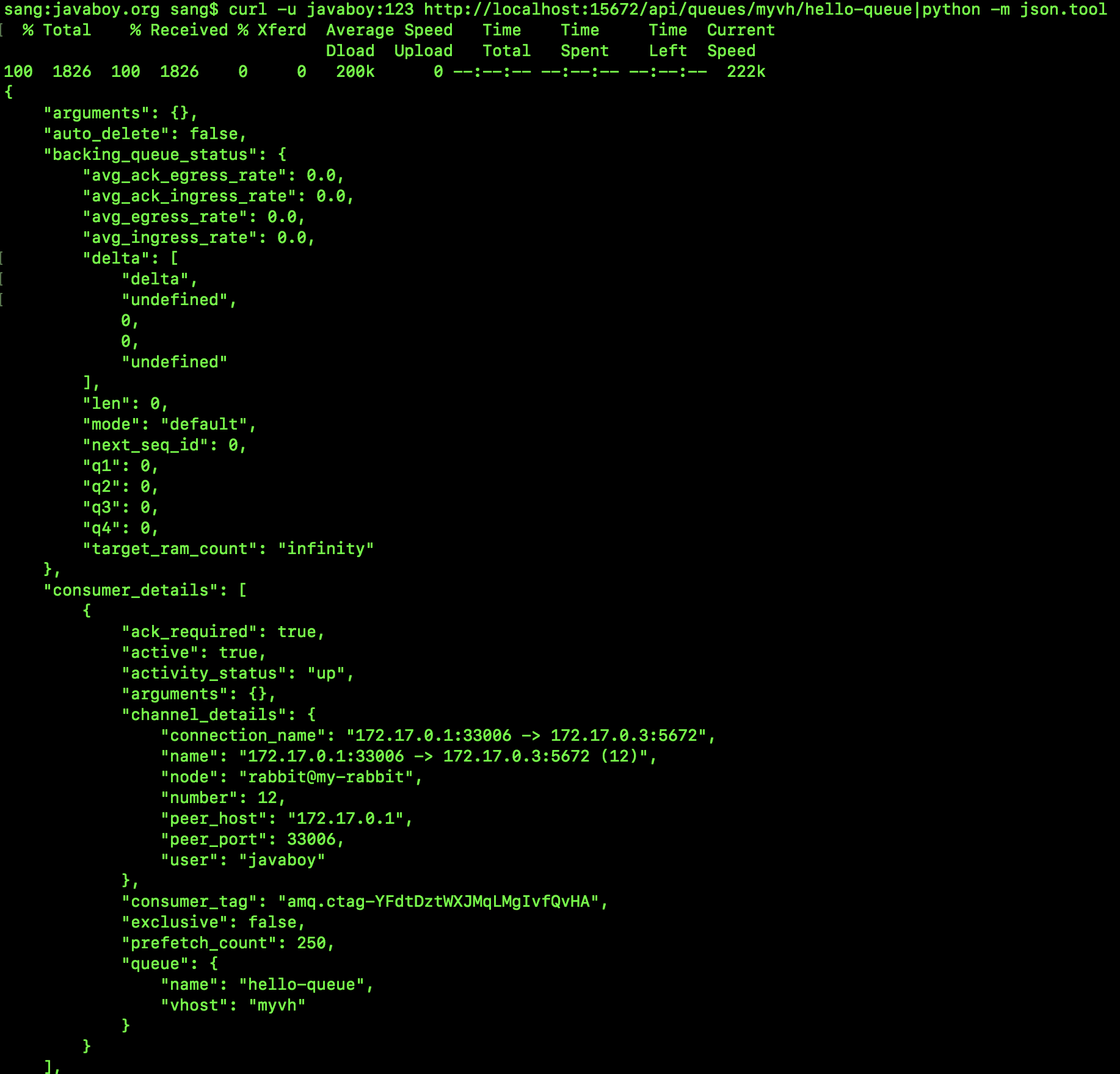 接下来启动 consumer,此时发现 consumer 可以完成消息的消费(注意和前面的反向测试区分),这就说明镜像队列已经搭建成功了。