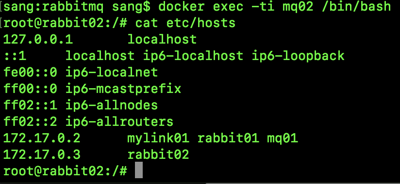 接下来进入到 mq02 容器中,首先查看一下 hosts 文件,可以看到我们配置的容器连接已经生效了: