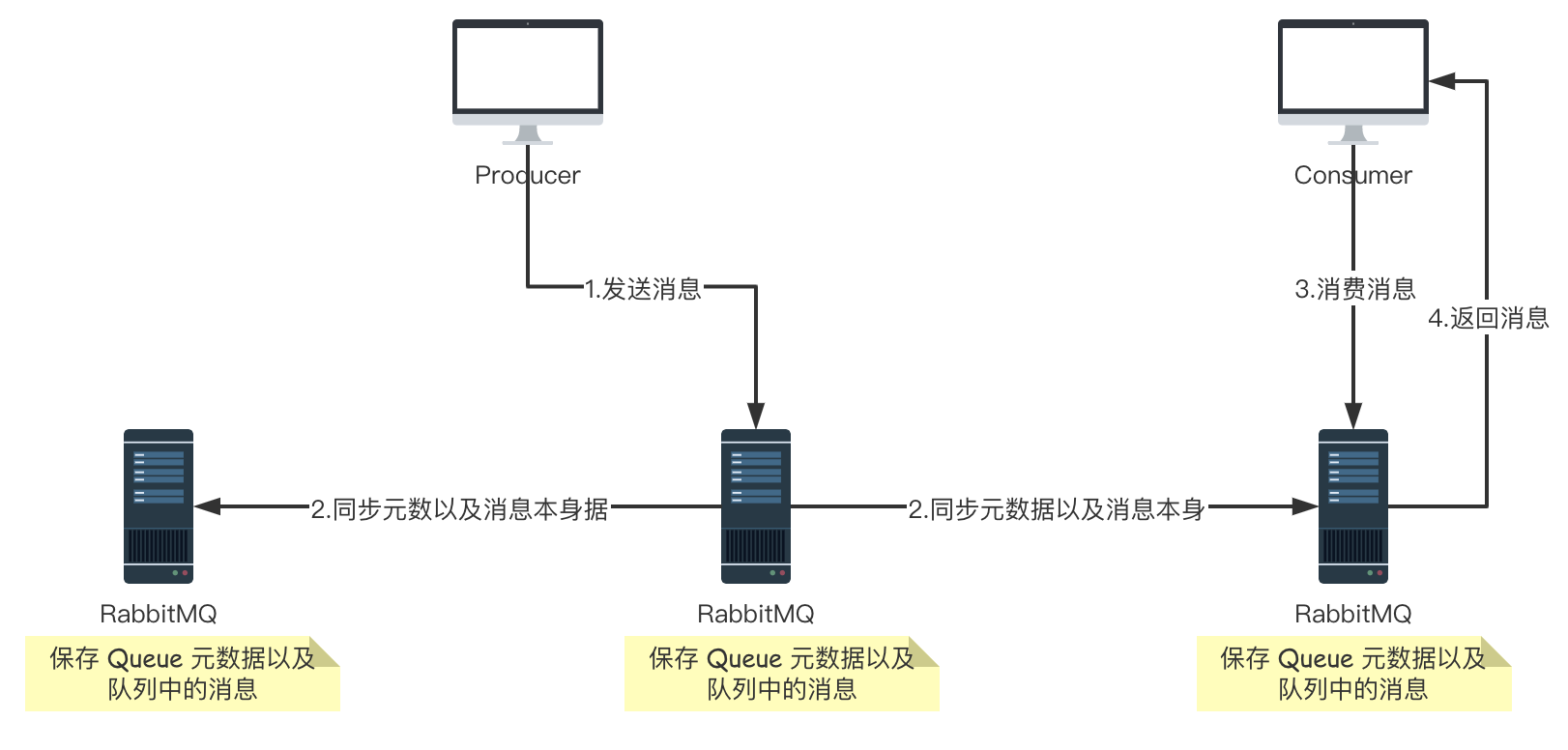 当我们消费消息的时候,如果连接到了另外一个实例,那么那个实例会通过元数据定位到 Queue 所在的位置,然后访问 Queue 所在的实例,拉取数据过来发送给消费者。