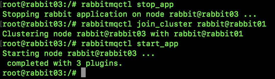 rabbitmqctl join_cluster rabbit@rabbit01