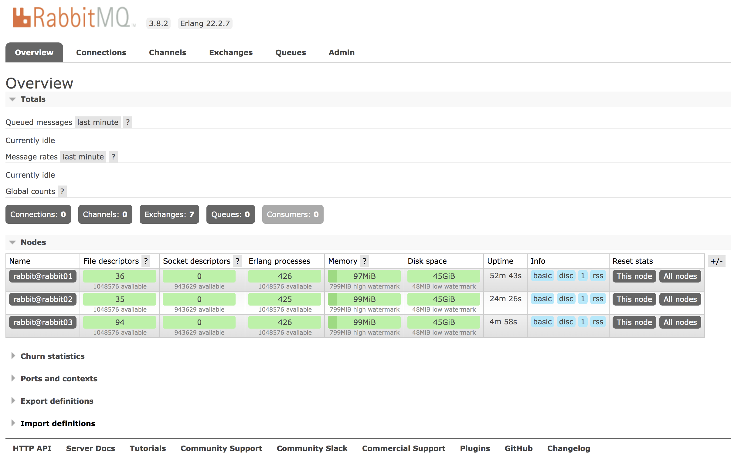其实,这个时候,我们也可以通过网页来查看集群信息,在三个 RabbitMQ 实例的 Web 端首页,都可以看到如下内容: