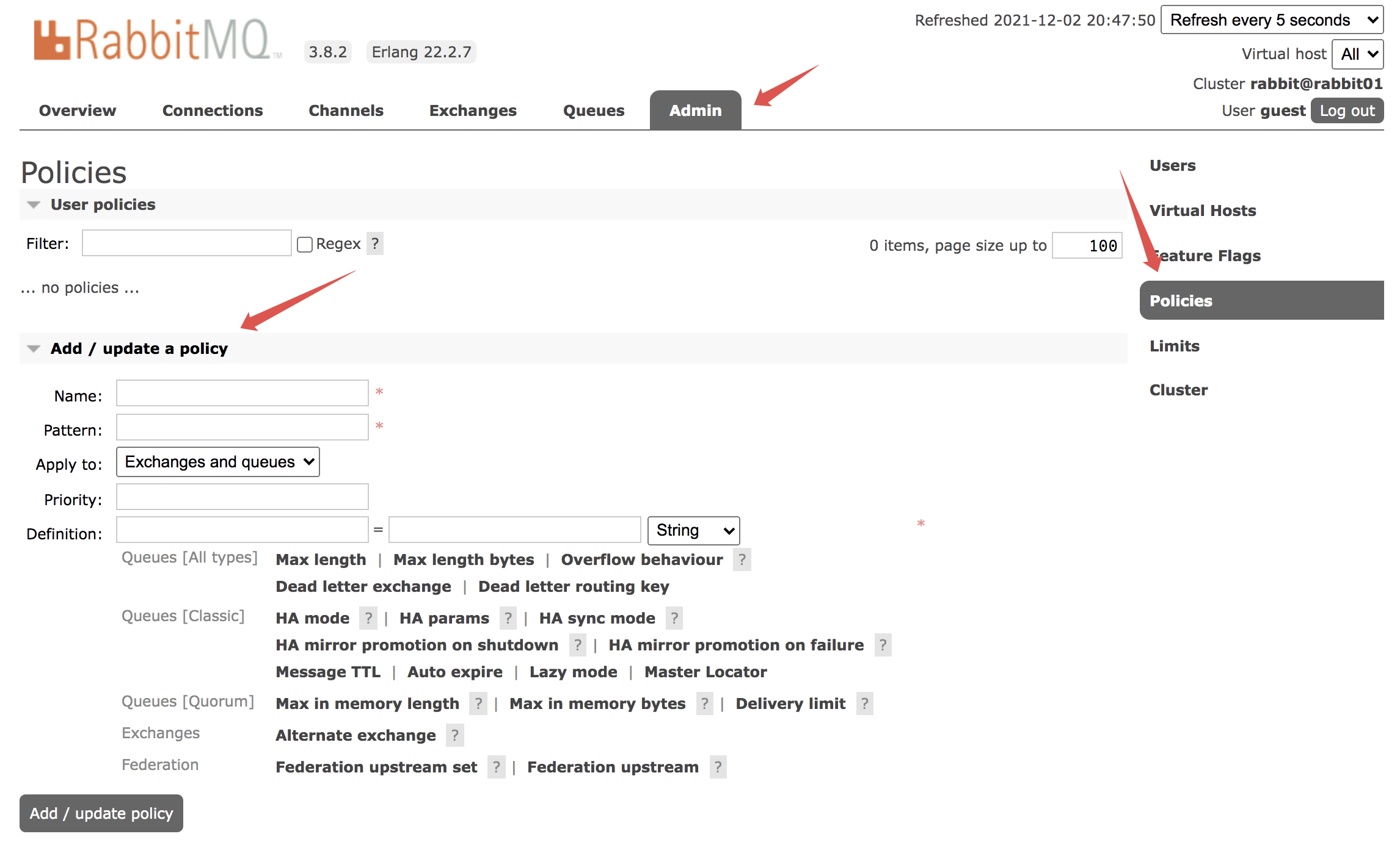 点击 Admin 选项卡,然后点击右边的 Policies,再点击 Add/update a policy,如下图:
