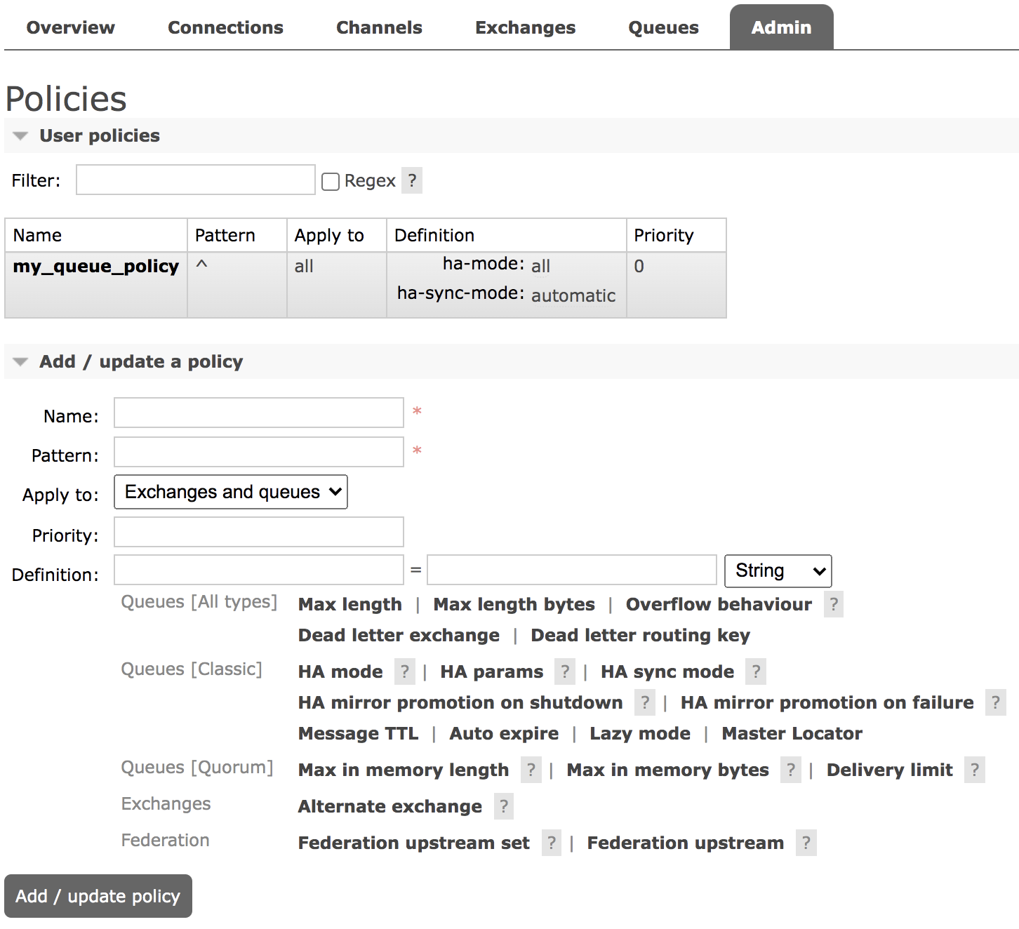 rabbitmqctl set_policy -p / --apply-to queues my_queue_mirror "^" '{"ha-mode":"all","ha-sync-mode":"automatic"}'