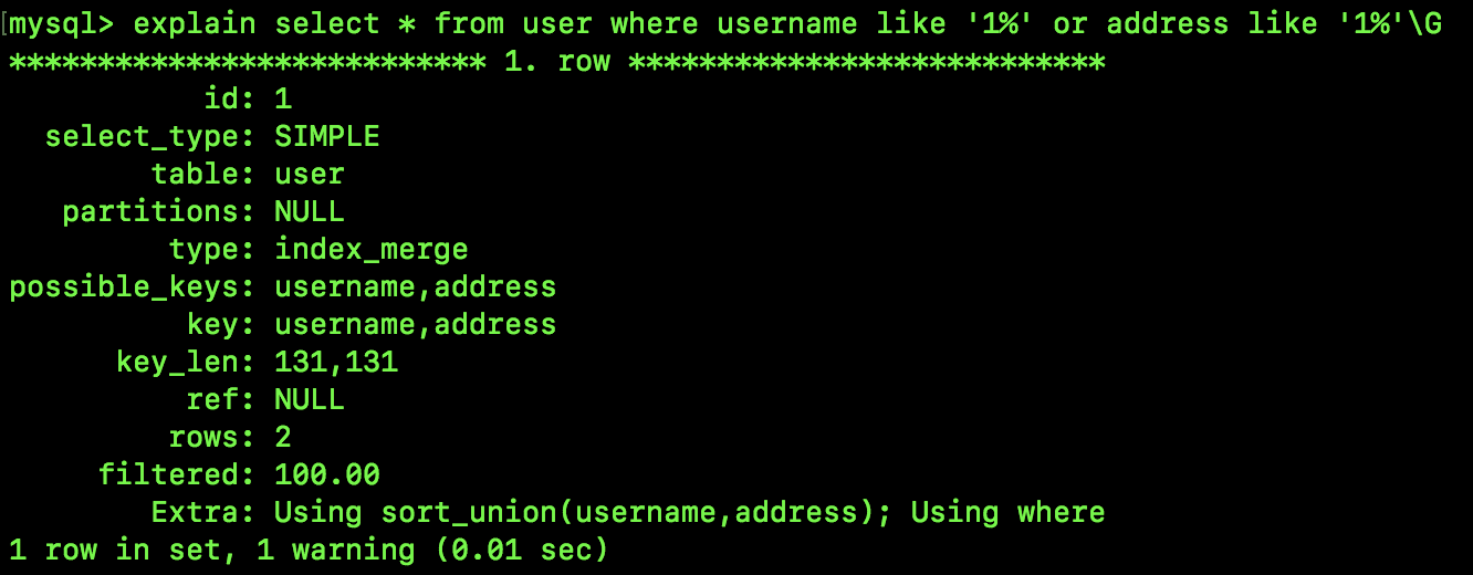 这个 SQL 在执行的过程中就会涉及到两个索引,需要去两棵索引树中进行搜索,再对搜索结果求并集,我们来看一下该 SQL 的执行计划: