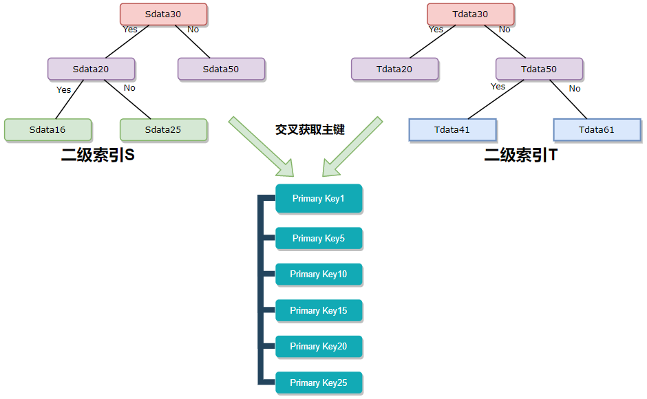 假设有二级索引 S 和二级索引 T,现在交叉获取主键(这里有一点需要注意,如果我们是单独在 S 和 T 上搜索,且 S 上搜索条件是 username like '1%',T 上的搜索条件是 address like '1%',那么在搜索的过程中,各自拿到的主键 id 是有序的,这也是 intersect 的前提):